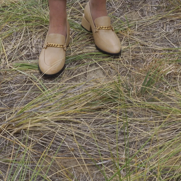 Indulge in luxury with our CASTELLA heeled loafers. Crafted with a discerning eye for detail, each shoe features a classic design and a sleek block heel for effortless style. Adorned with a hand-finished metal chain, these loafers epitomise elegance and sophistication. Experience the superior quality and craftsmanship for yourself.